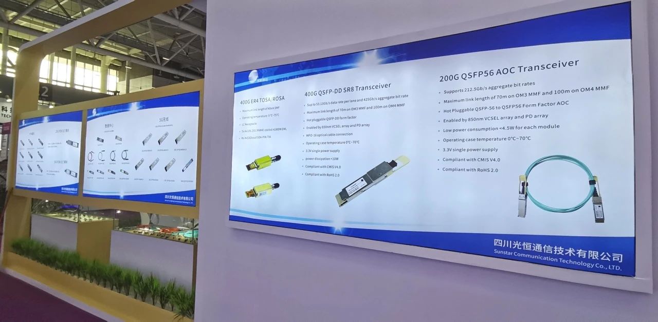 此次CIOE光博會(huì),光恒公司帶來了三大類產(chǎn)品:接入網(wǎng)10G Combo OLT 、數(shù)據(jù)中心400G高速模塊、傳感類及激光雷達(dá)產(chǎn)品。400G高速模塊應(yīng)用在數(shù)據(jù)中心,解決了高速率數(shù)據(jù)傳輸?shù)碾y題,為客戶提供可靠性方案。本次主要展出產(chǎn)品有400G QSFP-DD SR8、400G QSFP-DD FR4、400G QSFP112 DR4、200G QSFP56 AOC、25G PON OLT SFP28、50G PON OLT SFP56等光模塊產(chǎn)品及400G ER4 TOSA/BOSA、XGS PON Combo ONU OSA、50G combo PON OLT三模OSA、25G ZR SOA ROSA等光器件產(chǎn)品。