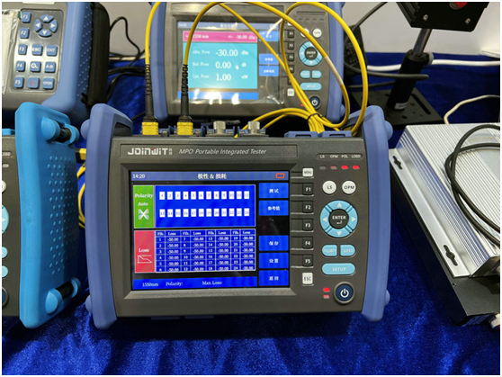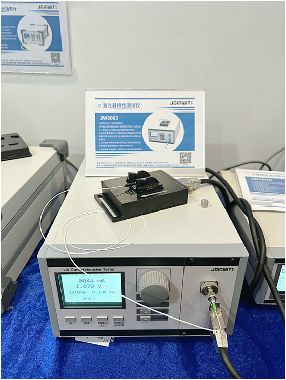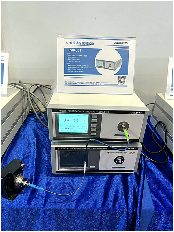 1:偏振消光比測試儀(JW8605J),相較于之前的產品,本次展出的JW8605J偏振消光比測試儀具有:更大的動態方位PER、更高精準度及穩定性、更快的測試速度、支持保偏光纖光軸角度測試以及一鍵式便捷操作等特點。可應用于保偏光纖熔接檢測、Y分值光纖陀螺測試;光學器件偏振軸對準、測量保偏光纖消光比、保偏光纖與光源對準、PM耦合器測試及偏振分束器等場景。