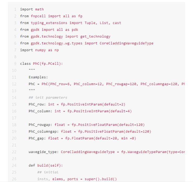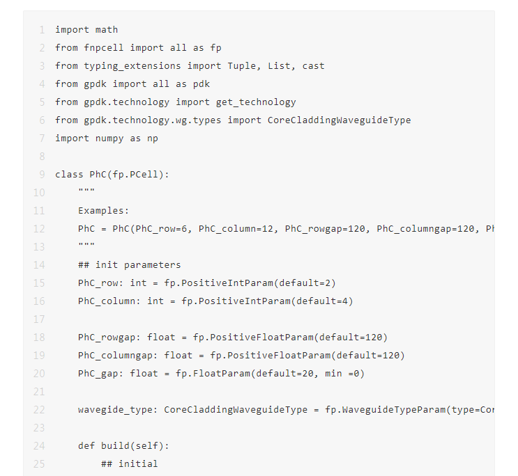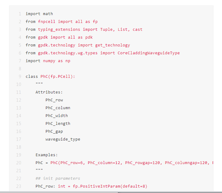 光子晶體為周期結構,基本單元也從傳統的單一規則結構演變成多個基本結構組合的結構到沒有規律的拓撲結構。教程提供的代碼從底層出發,支持用戶自定義周期結構,在用戶定義的周期結構的基礎上通過幾個簡單參數即可實現任意光子晶體鏈路的搭建。