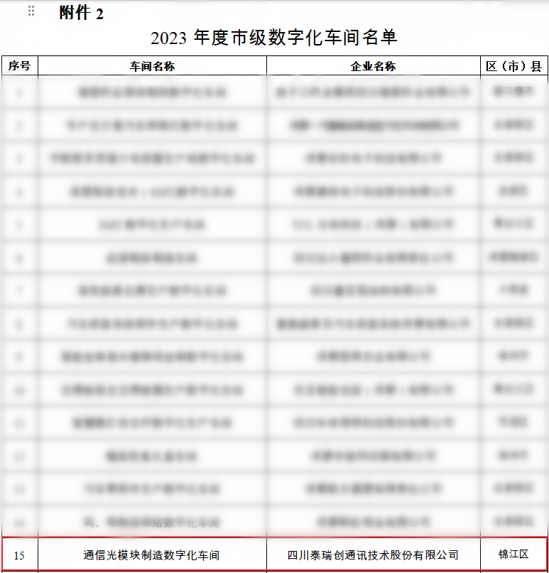 經(jīng)企業(yè)自主申報(bào)、區(qū)(市)縣工業(yè)和信息化主管部門(mén)推薦、專(zhuān)家評(píng)審、網(wǎng)上公示等程序,四川泰瑞創(chuàng)通訊技術(shù)股份有限公司被成都市經(jīng)濟(jì)和信息化局評(píng)為“通信光模塊制造數(shù)字化車(chē)間”,標(biāo)志著公司在智能制造和數(shù)字化轉(zhuǎn)型方面取得了突破性成果。