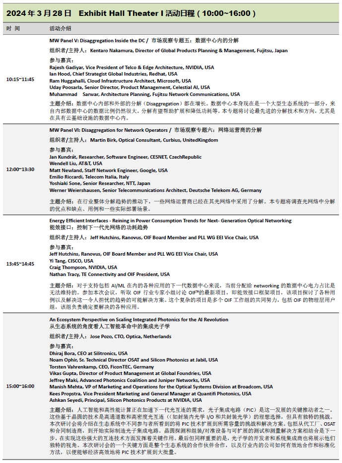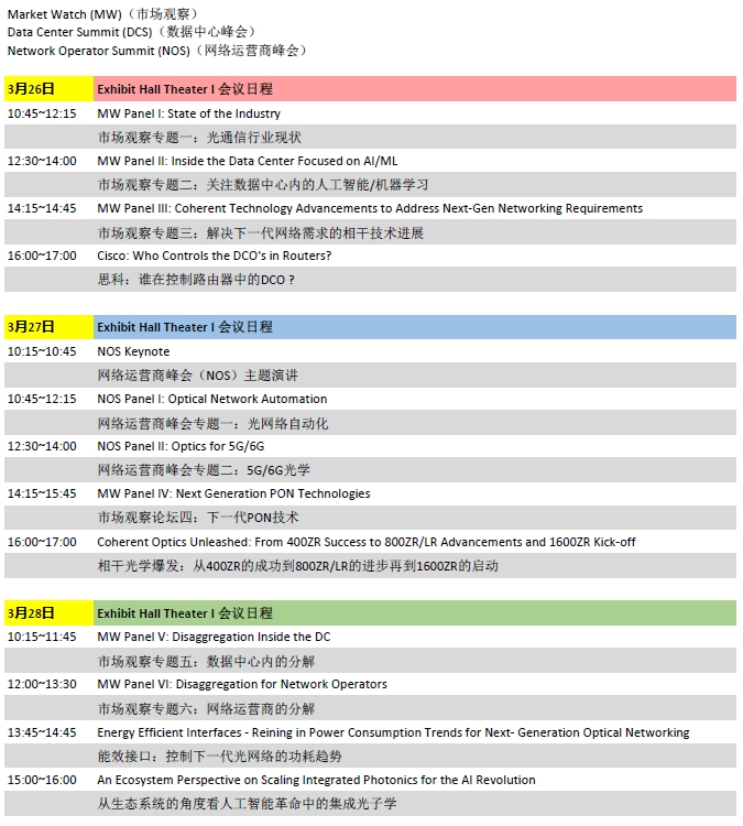 OFC在展場設置了三個會場:Exhibit Hall Theater I、Exhibit Hall Theater II、Exhibit Hall Theater III,每個會場都有為期三天(3.26-3.28)的會議活動。以下是Exhibit Hall Theater I(一號廳)三天的活動安排日程。