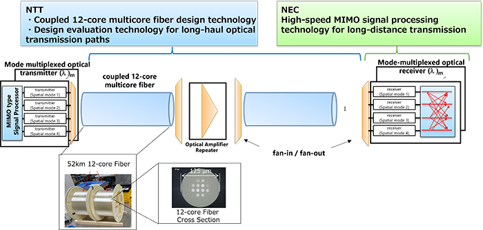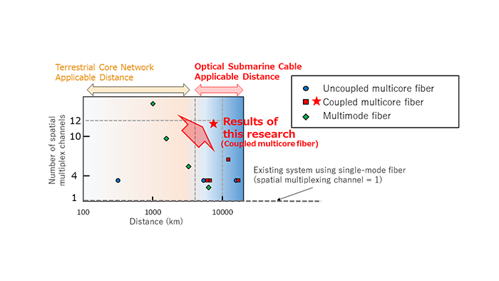 Figure 3: Trends in long-haul optical transmission using space-division multiplexed fibers of standard outer diameters and the positioning of these research results