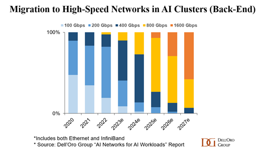 ICC訊 隨著AIGC應(yīng)用和大模型的出現(xiàn),催生了AI算力需求的激增,進而也推動著數(shù)據(jù)中心基礎(chǔ)部件-光模塊迭代升級步伐的加快。光模塊速率開始向800G邁進,更有不少龍頭企業(yè)已經(jīng)開始布局1.6 Tbps光模塊。Dell 'Oro預(yù)測:到 2025 年,人工智能網(wǎng)絡(luò)中的大多數(shù)端口將達到 800 Gbps,到 2027年,大多數(shù)端口將達到1600 Gbps,呈現(xiàn)出非常快的速度。