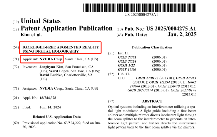 日前,英偉達在美國專利及商標局官網公開了一項名為“無背光增強現實數字全息技術”的AR眼鏡專利(專利號US20250004275A1)。