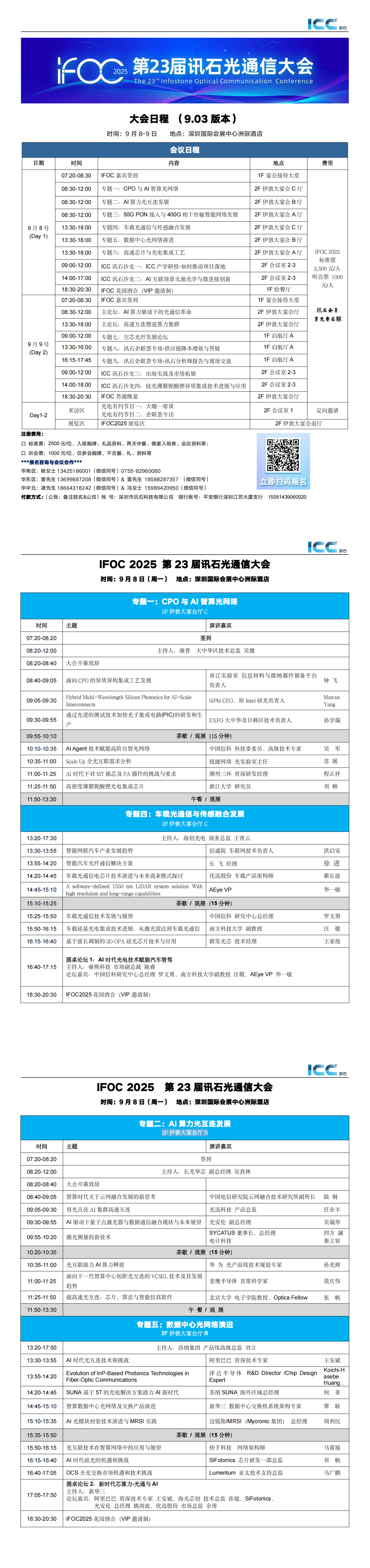 9+專題分會,覆蓋CPO、超節(jié)點、50G PON、高速相干傳輸、車載光通信、激光雷達傳感、數(shù)據(jù)中心光網(wǎng)絡(luò)、硅光與異質(zhì)集成工藝、空芯光纖、無源光器件與連接器、高速光電芯片、市場分析預(yù)測、供應(yīng)鏈降本增效等話題