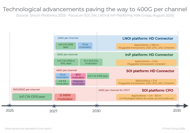 更高的每通道速率使單端口以太網速度達到3.2Tbps(甚至更高),同時實現更好的節能效果和激光器數量減少。更少的激光器降低了資本支出,簡化了供應鏈,并減少了冷卻和供電的運營成本。在這一方向上,我們看到其他新平臺帶來的機遇。由于內在材料特性,LNOI和InP成為未來高速鏈路的更直接解決方案。對可擴展、高能效且具成本效益的光解決方案的需求,引發了SOI(含TFLN、BTO和聚合物)、LNOI和InP平臺之間的激烈競爭。每種平臺都具有獨特優勢和挑戰,共同塑造著IM-DD或Coherent-lite可插拔模塊的未來,并影響著更廣闊的光通信格局。