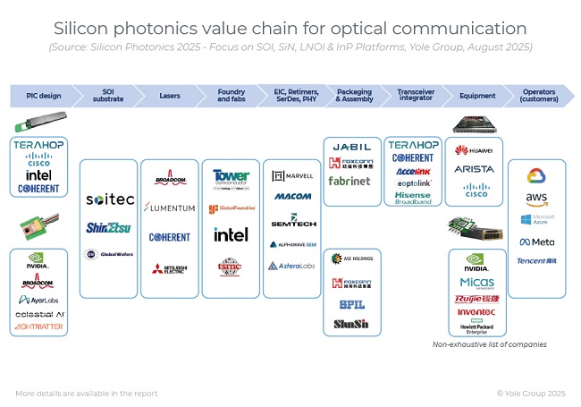 整個產業生態正圍繞多元化參與者形成:包括垂直整合巨頭(如旭創、思科、Marvell、博通、Coherent、Lumentum、新易盛)、初創企業/設計公司(Xphor、DustPhotonics、NewPhotonics、OpenLight、POET Technologies、Centera、AyarLabs、Lightmatter、Lightelligence、Nubis Communications)、研究機構(如加州大學圣塔芭芭拉分校、哥倫比亞大學、斯坦福工程學院、麻省理工學院)、代工廠(如Tower Semiconductor、GlobalFoundries、英特爾、AMF、imec、臺積電、CompoundTek)以及設備供應商(如應用材料、ASML、Aixtron、ficonTEC、Mycronic Vanguard Automation、Shincron)。所有這些參與者共同推動著產業的顯著增長與多元化發展。