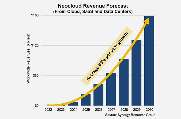 ICC  Synergy研究集團的新數據顯示,新云(Neocloud)收入在2025年第二季度已突破50億美元大關,較去年增長205%。預計全年收入將超過230億美元。Synergy預測,到2030年,新云收入將達近1800億美元,年均增長率為69%。