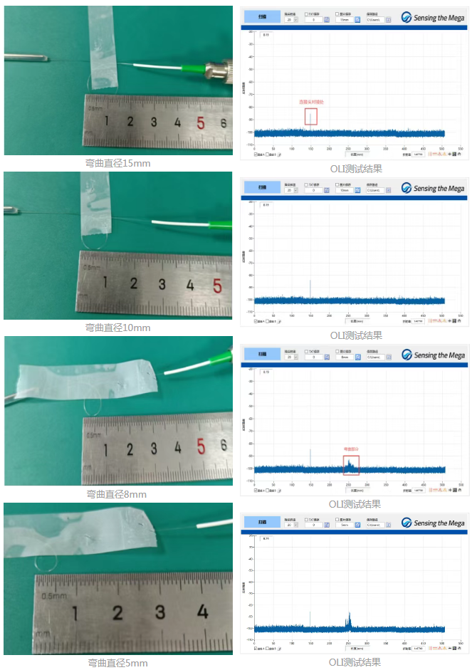 由以上測試結果可以看出,光纖彎曲直徑大于10mm時,回波信號低于-100db,設備無法檢測到信號強度變化;當彎曲直徑小于8mm時,彎曲部分的回波信號開始顯著增大,并被設備探測到(高于底噪靈敏度),并呈現出彎曲直徑越小,回損越大規律(推測在某一范圍內)。且結果曲線呈現一段距離內連續的反射增高情況,這符合彎曲的理論情況(彎曲導致某一段光纖都會發生連續的曲率變化,進而造成連續的高反射區,而非某個點的反射增高)。