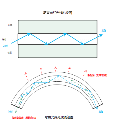 臨界角突破: 如果彎曲足夠劇烈(曲率半徑足夠小),入射角會小于發生全內反射所需的臨界角。