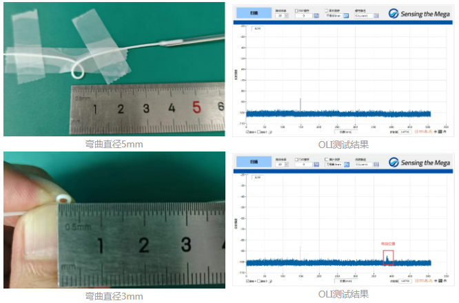 為了驗證OLI設備對光纖彎曲的測試效果,分別對常規單模光纖以及耐彎曲光纖在不同的彎曲直徑條件下,進行分布式回損掃描測試,測試結果如下: