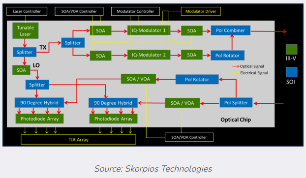 Skorpios(https://www.skorpiosinc.com/)是一家美國初創公司,開發了一種將其他材料制成的光學組件直接集成到硅電路——特別是可以調制光信號的硅光子電路——中的方法。該公司通過在硅中精確位置刻蝕凹坑來實現這一點,使得InP激光器芯片和其他光學組件可以在無需人工干預的情況下放入。Skorpios將其工藝瞄準數據中心和相干光學市場,并已列出多種量產的數據中心模塊和相干PIC。