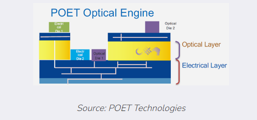 POET(https://poet-technologies.com/)開發了一種光學中介層,該中介層與標準制造技術集成,簡化了光學和電氣組件在晶圓層面的集成。采用POET技術,電氣器件仍在硅晶圓上互連,而光學器件則通過構建在硅頂層的波導進行互連。其目的是制造非常緊湊、完全集成的器件,在晶圓級別組合所有組件,而無需在后期進行放置和互連。