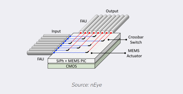 nEye(https://www.neye.ai/)是一家源自加州大學伯克利分校Ming Wu教授實驗室的早期初創公司,成立于2020年。nEye正在開發使用基于硅光子學中微機電系統(MEMS)交叉開關的PIC進行光子交換。公司認為其優勢在于PIC的尺寸非常小、成本低、可靠性高、延遲低和交換速度快。