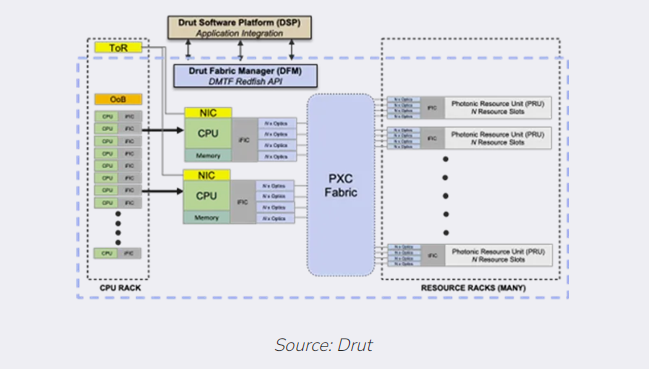 Drut(https://drut.io/)正在開發一個支持AI節點資源虛擬化解耦(virtual disaggregation)的平臺,包括完整的軟件棧、PCIe接口卡以及基于MEMS的光電路交換機。該組合允許內存和存儲等資源池化,并按需動態共享。