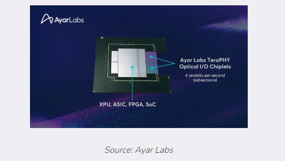 Ayar的首款產品TeraPHY芯片通過八個256Gbps硅光引擎,在封裝內實現2Tbps帶寬,專為與交換機、GPU或其他處理器并排集成而設計。將光引擎與處理器共置可實現比傳統銅纜或可插拔光模塊更低的功耗、更低的延遲以及在更高速率下的更優性能——這也是眾多公司競相布局該領域的原因。CPO和LPO等方案也瞄準這一應用場景,但Ayar(及其他公司)的方案旨在將光學器件直接集成到處理器基板或多芯片模塊(MCM)上,更側重于AI節點內部而非節點間的連接。