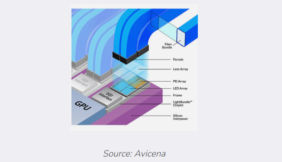 在Avicena的互連方案中,氮化鎵(GaN)LED陣列耦合到光纖束中,并垂直連接至基板。LED本質上是低功耗光源,但運行速度較低、傳輸距離較短。通過LED陣列,Avicena 可讓每個LED以較低速率運行,從而實現高聚合互連速率。這需要一顆用于速率轉換(gearboxing)的芯片(會增加功耗和空間需求),但Avicena聲稱整體鏈路功耗仍低于其他方案。