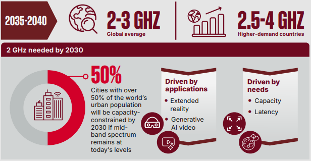 這份名為《2040愿景:未來移動連接的頻譜》(文末附下載鏈接)的報告是對即將到來的“6G”時代頻譜需求的全面全球評估。報告得出結論,到2035-2040年,每個國家平均需要2-3 GHz的全球中頻段頻譜,以滿足需求最高的城市地區的移動網絡容量需求,需求較高的國家則需要2.5-4 GHz。