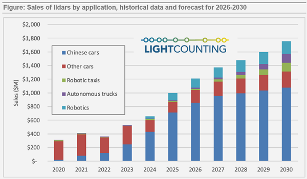 機器人技術顯然推動了這一增長,但其中大部分貢獻來自車載激光雷達。我們在去年曾報道中國電動汽車制造商對激光雷達的需求蓬勃興起,而這一市場在2025年的表現超出了我們的預期。