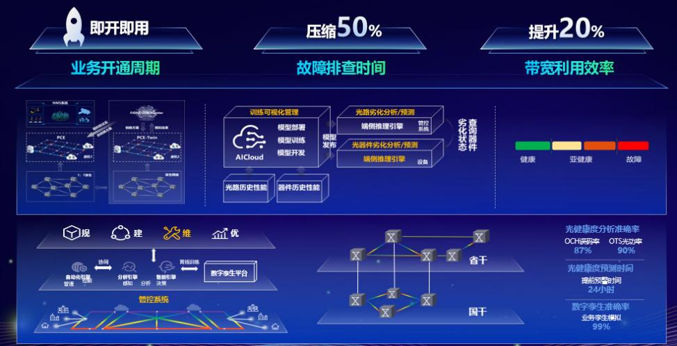 強化光層智能賦能,以數字孿生為核心,通過光層感知、預測能力構建網絡全生命周期虛擬鏡像,提前識別400G信號衰減、鏈路干擾等潛在風險,疊加ASON智能光層自動重路由功能,推動運維模式從“被動搶修”到“主動預防”的轉變。